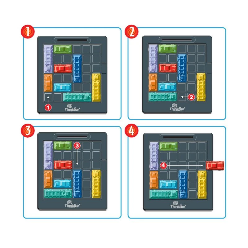Voici par exemple un défi simple à réaliser. AprÚs avoir placé les voitures en suivant le schéma de la carte, il faut (1) monter la voiture orange, (2) décaler vers la gauche le bus vert, (3) faire descendre le bus bleu et enfin (4) faire sortir la voiture rouge.