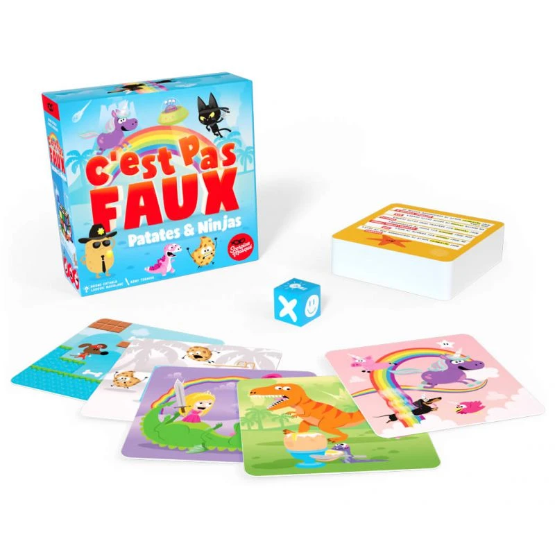 Ce jeu nous revient dans une nouvelle version : C’est pas faux patates et ninjas plus fun et surtout plus visuel car les questions Ă©crites sont remplacĂ©es par des images reprĂ©sentant des scènes farfelues. Les participants devront alors rĂ©pondre le plus rapidement possible Ă une question en relation avec l’image et en fonction du rĂ©sultat du lancĂ© de dĂ©, soit en donnant la bonne rĂ©ponse, soit en donnant une mauvaise rĂ©ponse, soit en rĂ©pondant c’est pas faux si il n’y a pas de rĂ©ponse logique.