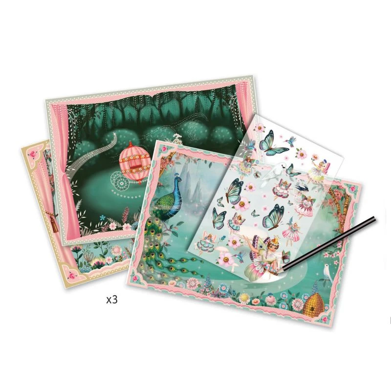 Au pays des fées est un magnifique coffret de décalcomanies pour les jeunes filles de 4 à 8 ans. Ce coffret de Djeco contient 3 grands décors féeriques et 3 feuilles de décalcomanies. Les décalcomanies sont des illustrations de fées, de fleurs, de papillons, d’oiseaux, … dans de jolis tons pastels