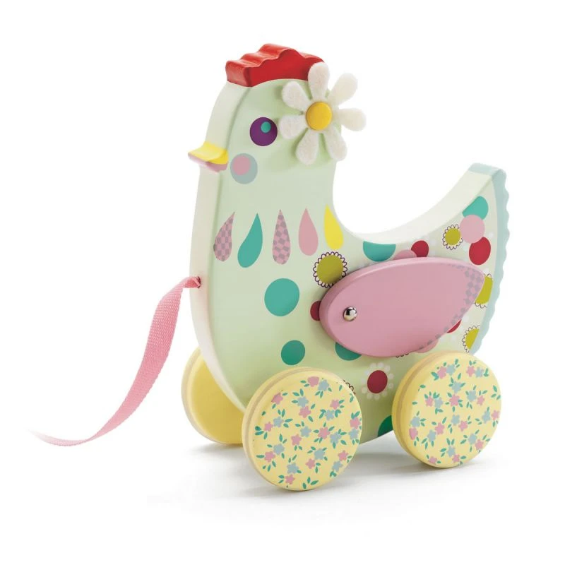 Cotcotte est une charmante petite poule à traîner dans les tons pastel. Ses ailes s’animeront lors des promenades de bébé qui pourra le traîner en tirant sur la bande de tissu rose. Les roues sont cerclées de caoutchouc afin d’éviter de faire du bruit en roulant sur les parquets ou les carrelages.