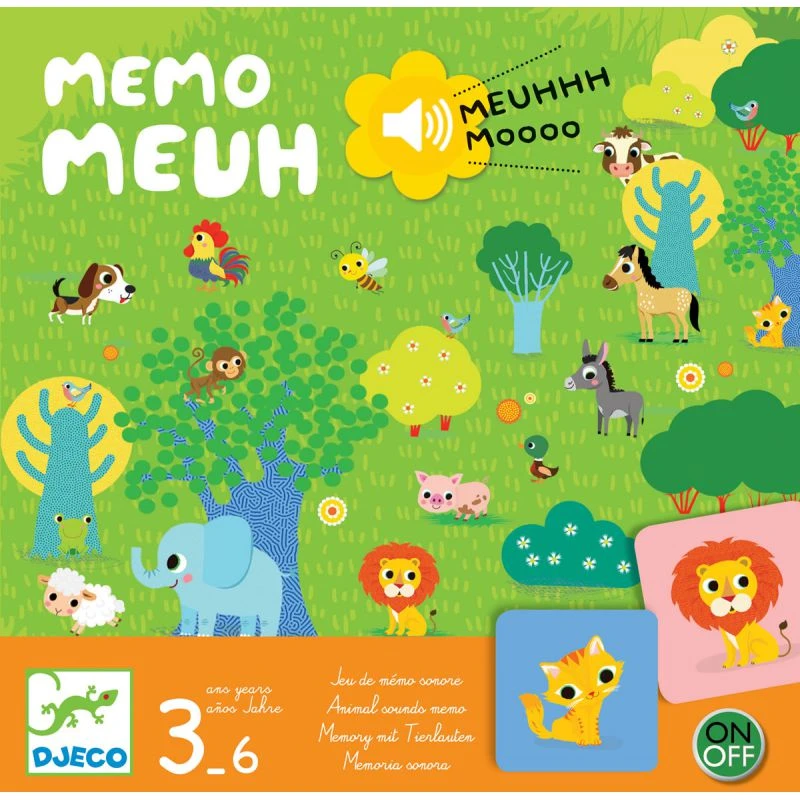 Memo Meuh est un jeu de mĂ©mory rigolo et original. Contrairement aux jeux classiques de mĂ©mory, il ne s’agira pas d’associer 2 cartes mais une carte reprĂ©sentant un animal et un son reprĂ©sentant le cri de l’animal. A son tour chaque joueur retournera une carte et devra retrouver sur le plateau la pastille qui dĂ©clenche le cri de l’animal dĂ©couvert. A chaque partie les sons sont mĂ©langĂ©s.