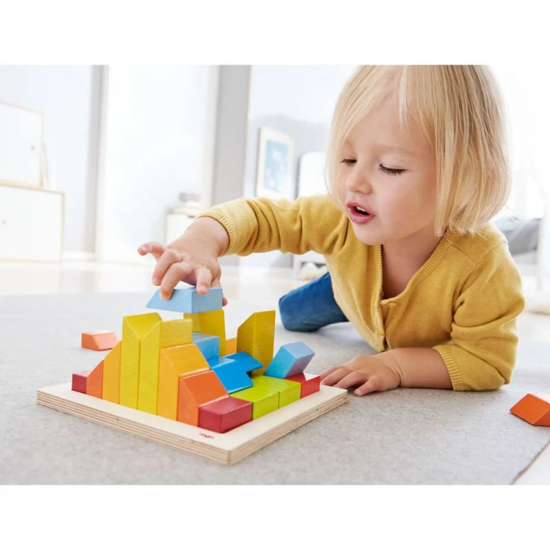 Creative Stones est un très beau jeu d’assemblage en bois colorĂ©. Les 28 pièces de diffĂ©rentes formes permettront de nombreuses constructions et associations qui mettront autant Ă contribution les talents crĂ©atifs que la logique des jeunes enfants. Dès 2 ans les petits pourront s’amuser avec ces formes en les disposant Ă plat dans le cadre fourni. Une fois Ă l’aise avec ces formes gĂ©omĂ©triques, ils pourront s’essayer Ă crĂ©er des architectures en 3 dimensions. Les plus aguerris pourront se lancer dans les 30 dĂ©fis proposĂ©s sur les cartes modèles (dĂ©fis rĂ©partis en 3 niveaux de difficultĂ©).