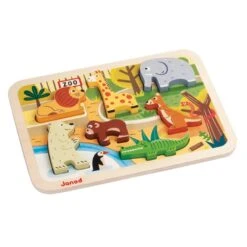 Très joli puzzle sur les animaux du zoo avec des pièces de 1,5 cm d’épaisseur. Grâce à leur épaisseur les pièces tiennent debout et peuvent faire office de figurines pour imaginer des histoires au zoo ou dans la savane. Leur épaisseur permettra également aux enfants dès 18 mois de les manipuler sans difficulté pour les insérer dans le puzzle.