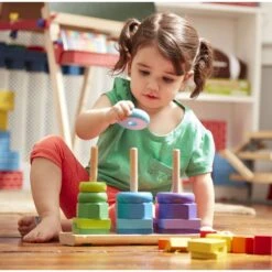 Mélanger toutes les pièces ensemble. Demandez aux enfants de trier les pièces en fonction de la forme. Demandez leur d’empiler les morceaux dans trois tours sans utiliser les tiges pour les plus grands.
