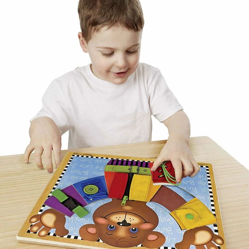 La planche comprend six pièces correspondants aux six aptitudes de base suivantes : attacher une boucle de ceinture, faire des lacets, mettre un bouton, attacher une fermeture à glissière, fermer un bouton à pression et une fermeture éclair.