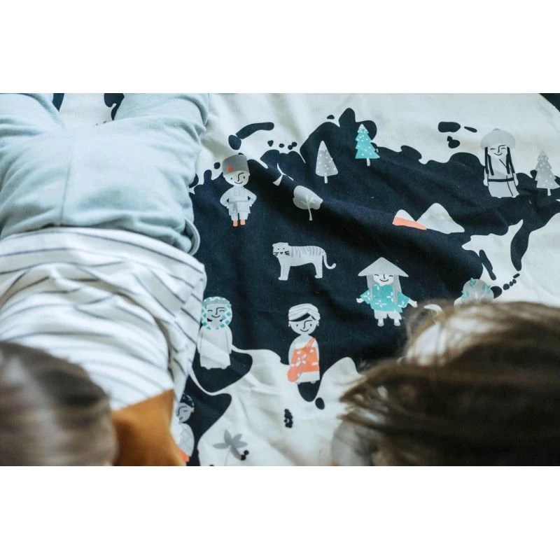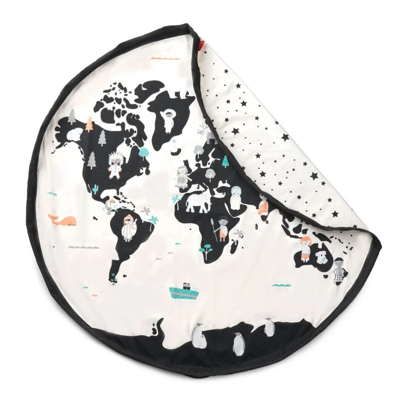 CĂ´tĂ© face, les enfants dĂ©couvriront une illustration d’une carte des continents avec des personnages et des animaux reprĂ©sentant chaque rĂ©gion. Ils pourront utiliser cette carte pour leurs jeux imaginatifs. CĂ´tĂ© pile vous dĂ©couvrirez un joli sac de rangement parsemĂ© d’Ă©toiles. Le sac se plie en un tour de main, un vrai tour de magie ! Les enfants peuvent ainsi profiter de cette grande surface de jeu (140 cm de diamètre) et ranger ou transporter leurs jouets en tirant simplement sur la ficelle pour replier le sac