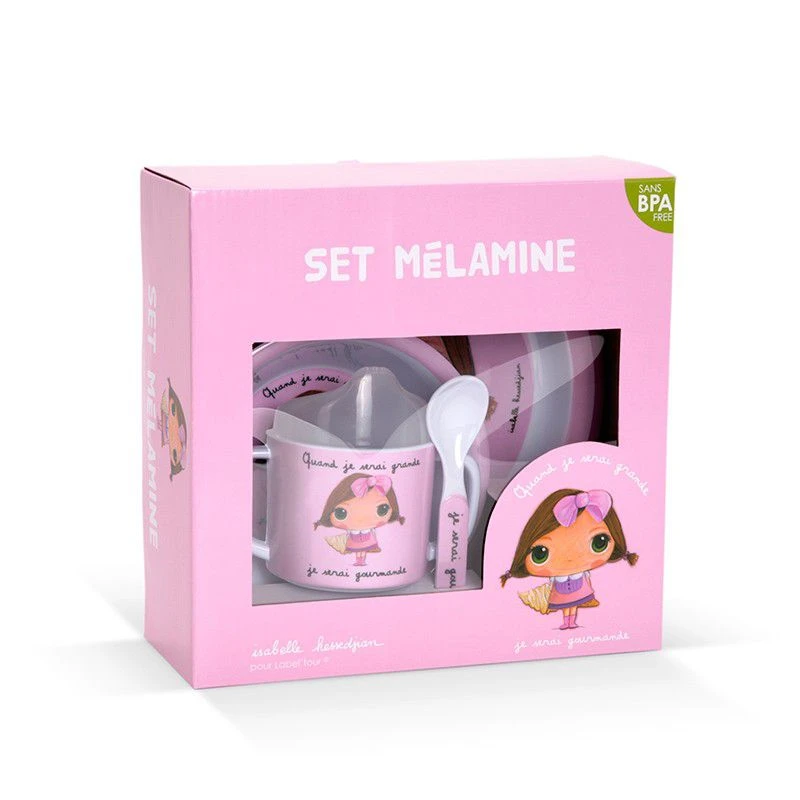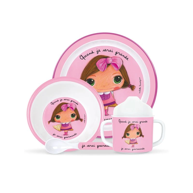 Le set de vaisselle quand je serai grande je serai gourmande est un set complet de repas en mélamine pour bébés et petits enfants illustré par l’artiste Isabelle Kessedjian. Ce set comprend une assiette plate, un bol, une cuillère et une timbale à poignée. Il sera parfait pour les premiers repas de bébé et plus tard pour les repas des petites gourmandes !